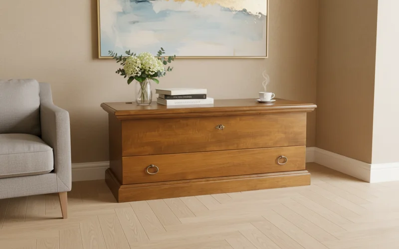 Cassapanca in legno massello, con cassetto, dalle linee sobrie e proporzionate.