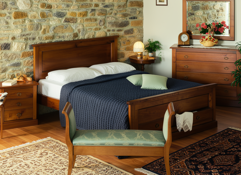 Letto matrimoniale in noce massello, con 2 capienti cassetti integrati ai piedi del letto, realizzato con lavorazione artigianale e finiture personalizzabili.